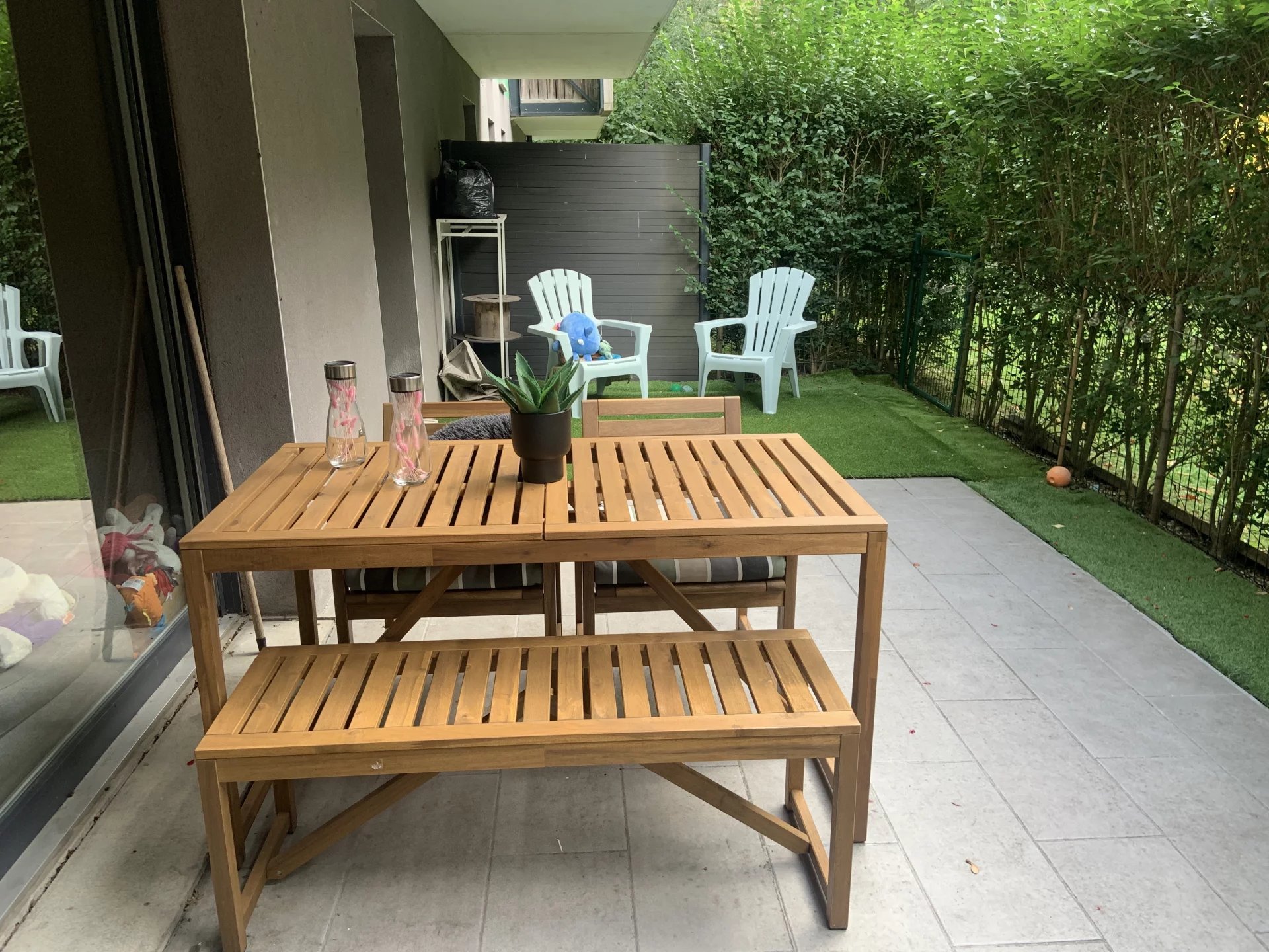 Une chambre avec dressing donne sur la terrasse arborée et une salle de bains wc buanderie.